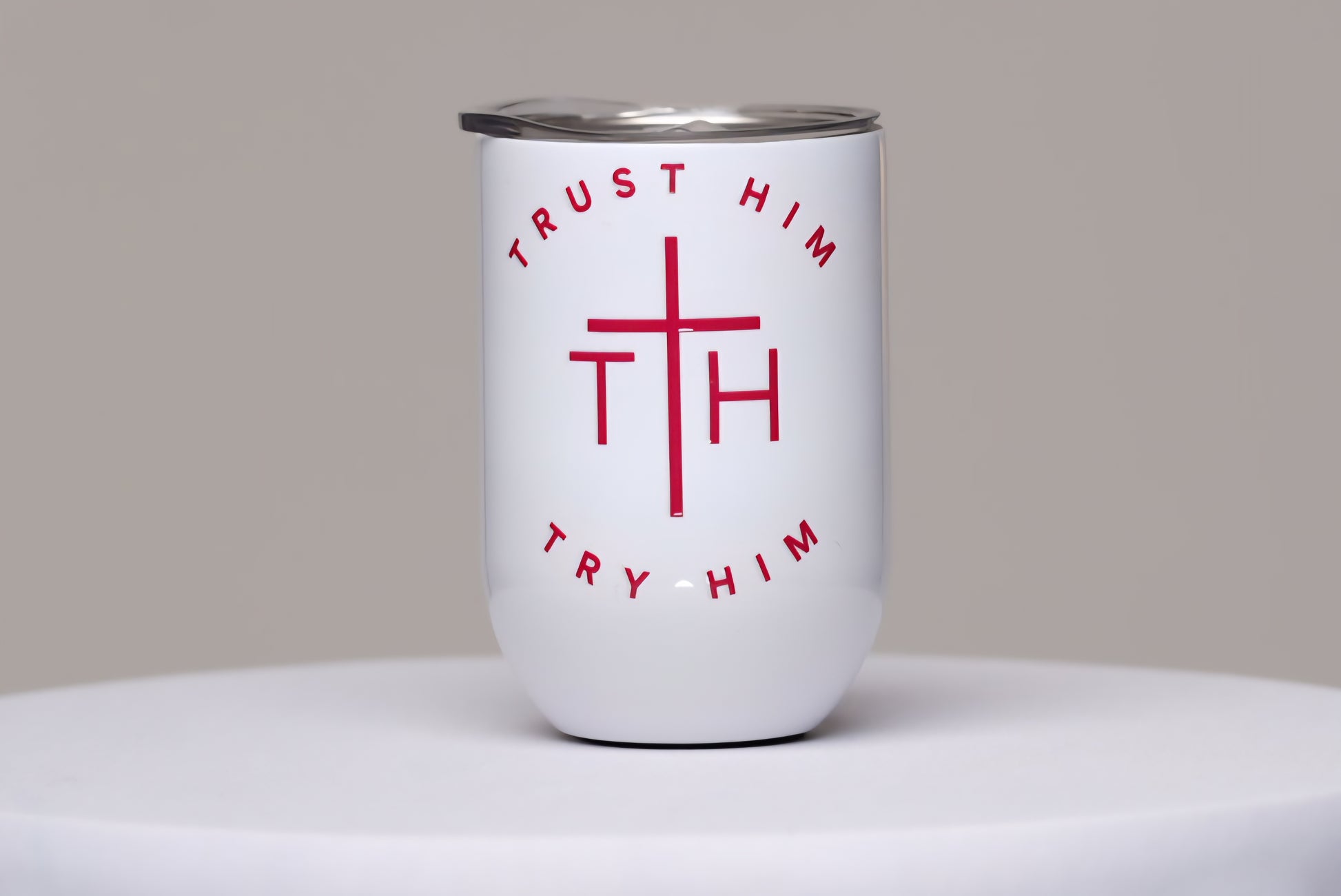 Sip with style and purpose. This 12 oz matte black stemless tumbler features the bold Trust Him Try Him design, reminding you daily to put your faith in God over the world’s “sure thing” (Psalm 40:4 MSG).